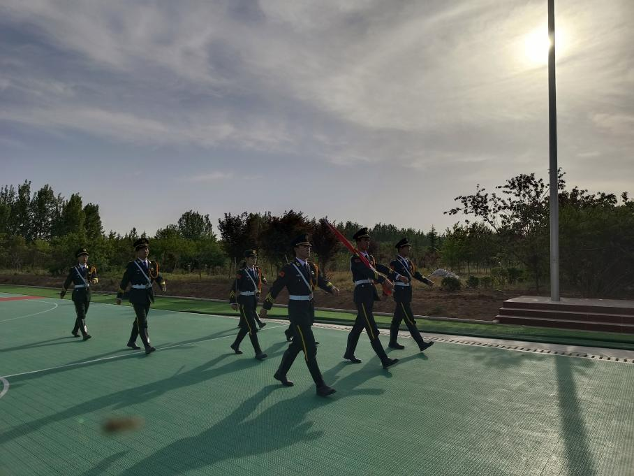 仪式开始,全体师生整齐列队,肃立广场。国旗护卫队队员们迈着铿销有力的步伐,护送着鲜艳的五星红旗走升旗台。在庄严的《义勇军进行曲》中,五星红旗冉冉升起,迎风飘扬,全体师生行注目礼。