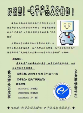 “学党史、践行动,解决群众身边的困难!”6月26日,在公司金年会金字招牌诚信至上支部书记高赋、教师景鹏斌和李鹏带领和指导下,电子俱乐部师生在宝鸡市灯头厂小区门口为公司周边群众开展电子产品义务维修活动。