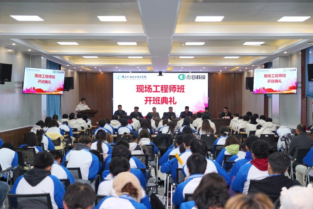 北京杰创科技有限公司总经理郑剑海、北京杰创永恒科技有限公司研发经理赵鹏翀、北京杰创永恒科技有限公司区域经理赵悦,陕西机电职业技术公司党委委员、副董事长张克,教务处(科研处、校企合作处)处长白娟娟,公司党支部书记杨鹏,金年会金字招牌诚信至上副经理娄勇,现场工程师班学员及师生代表共80余人出席。仪式由金年会金字招牌诚信至上副经理娄勇主持。