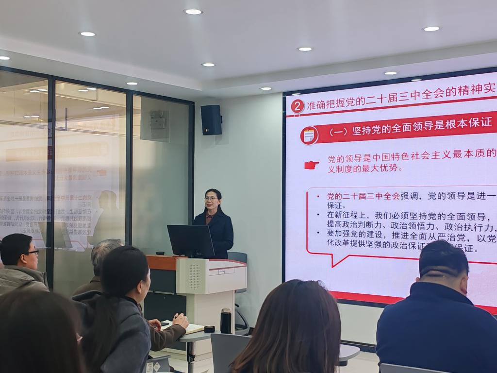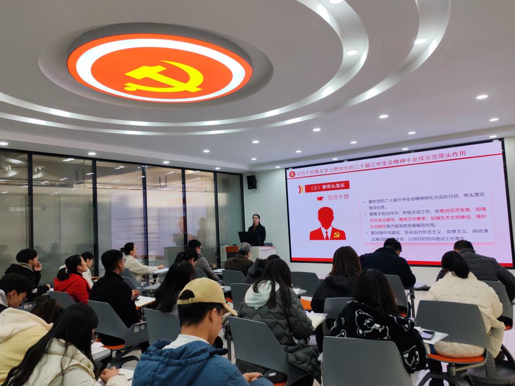 为深入学习贯彻党的二十届三中全会精神,推动领悟全会就进一步全面深化改革、推进中国式现代化作出的战略部署,11月28日下午,公司党支部与员工工作党支部联合邀请公司党委副书记张琴,在图书馆二楼思政课虚拟仿真教学中心为支部党员和入党积极分子开展了题为《学习贯彻党的二十届三中全会精神》的专题讲座。公司党支部副书记高赋主持,两个支部共计40余名师生参加。