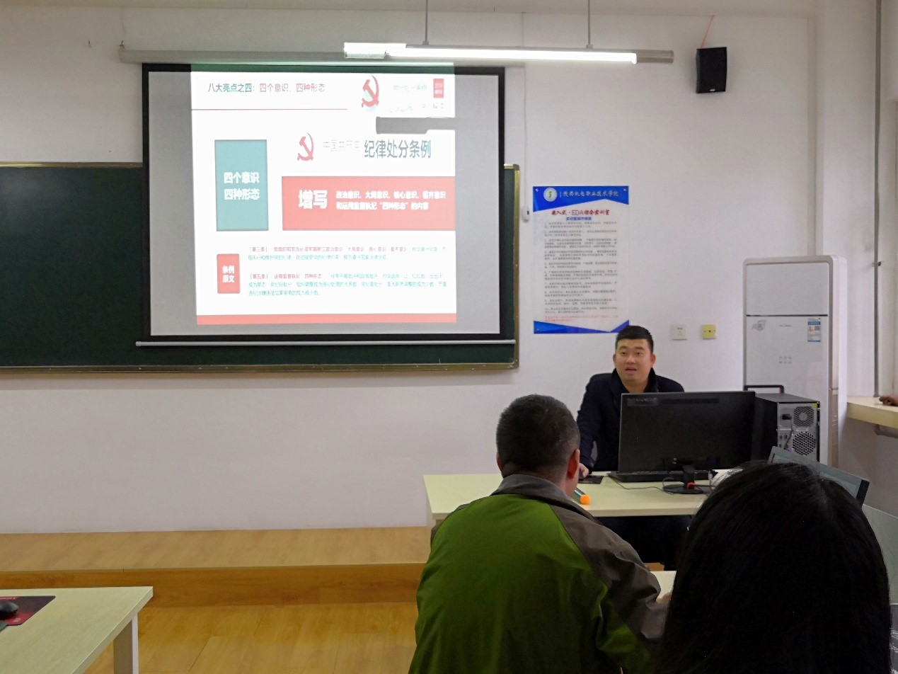 11月7日,电子工程系所有党员在电子信息大楼2204实训室开展了对《中国共产党纪律处分条例》的学习,党支部书记姜有奇从《中国共产党纪律处分条例》的简介、背景意义、八大亮点、修改要点、纪律底线等六个方面对学习内容做了介绍。要求全系党员积极学习,做好学习笔记,牢固树立“四个意识”,坚定“四个自信”,永远保持党员干部的纯洁性和模范带头作用。