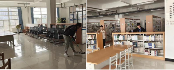 活动伊始,同学们共分为五组对图书馆地面、桌椅、书架进行清扫与擦拭。在打扫过程中,员工志愿者们仔细地打扫书架顶端、缝隙清洁死角,在美化图书馆环境的同时也兼顾了图书馆的阅读氛围,尽力做到“只清扫,不清扰”的活动目标,守护了安静舒心的阅读环境。