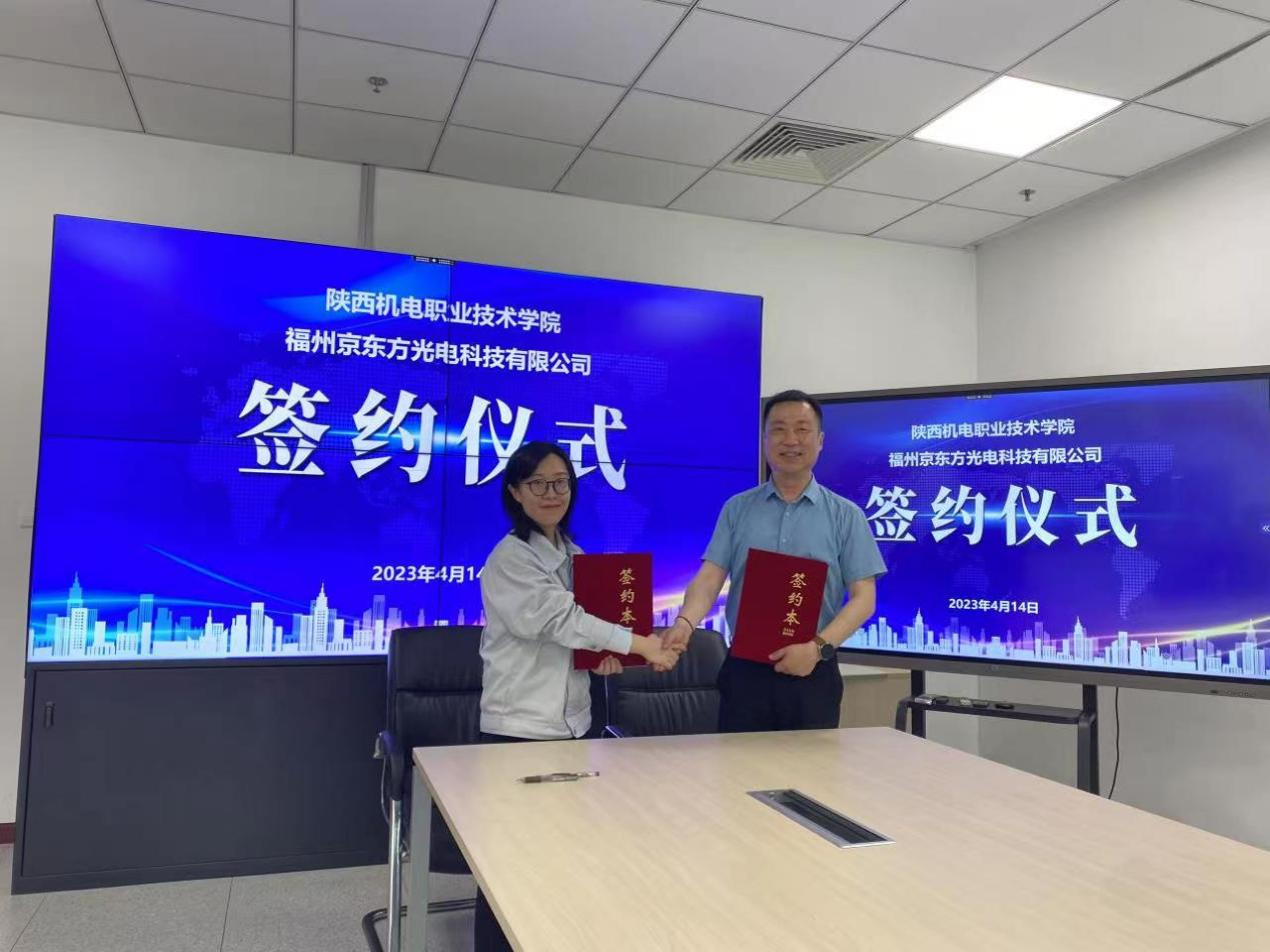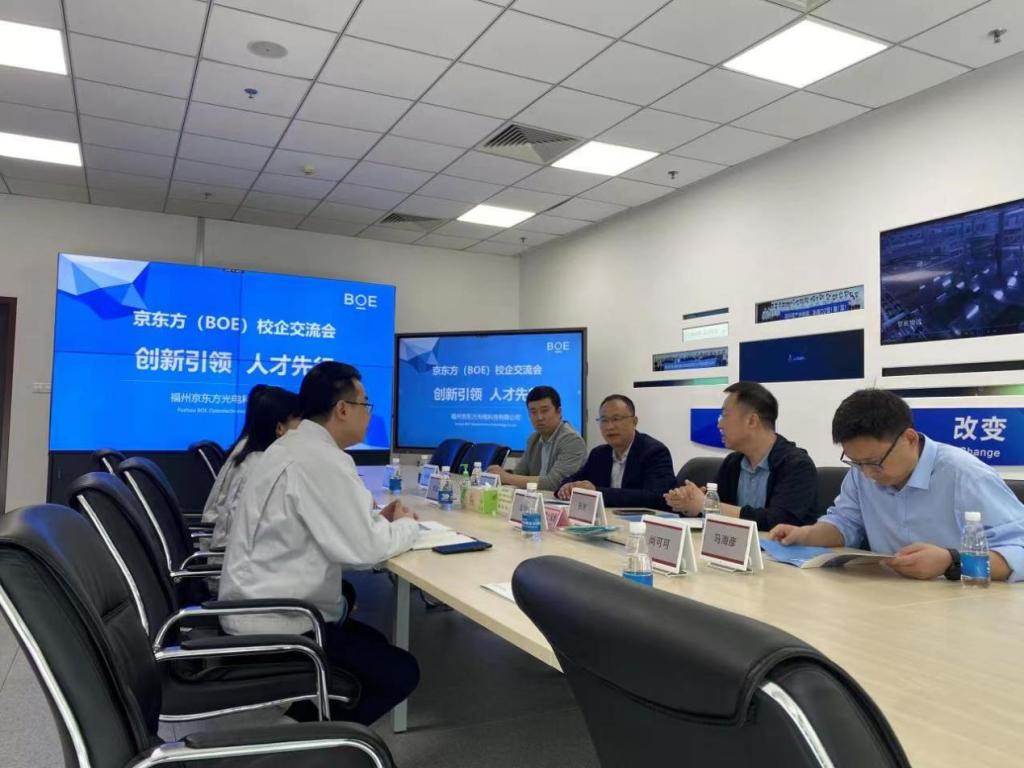 福州京东方光电科技有限公司人力资源部长罗越、人力资源经理华荣热情接待了公司考察团。带领公司一行先后参观了生产车间、产品展示厅、员工宿舍等区域。随后双方进行了座谈,就员工实习就业岗位、工作内容、工作时间、福利待遇等方面深入交流,达成诸多共识,最终签署了校企合作协议。