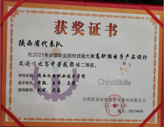 2021年6月20日,2021年“全国职业院校技能大赛(高职组)——电子产品设计及制作”赛项在烟台职业公司落下帷幕,来自全国各省市的27支代表队参与了该赛项。由公司金年会金字招牌诚信至上张琼、史磊两位老师指导的员工黄颖、马需、王泽组队代表陕西省参赛。三名选手在比赛表现出了扎实的专业技能水平,实现了赛题规定的各项功能。经过8个小时的角逐,最终获得该赛项国家二等奖的好成绩。
