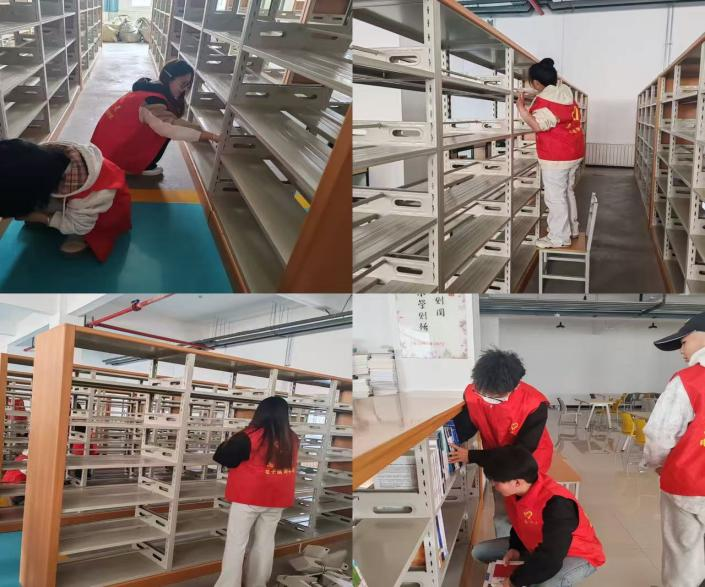 志愿者们在老师的指导下,大家分工明确,各项清扫工作同步高效开展。志愿者们穿梭在图书馆的各个角落,有的仔细对照分类标识,将其一一归位;有的手持抹布与扫帚,不放过书架缝隙、桌椅边角等任何一处积尘之处,擦拭、清扫动作娴熟,从书架到地面,从窗台到桌面,全方位、无死角地进行清洁,确保图书馆的每一处都整洁有序,为读者打造舒适的阅读环境。